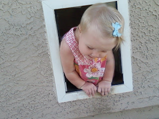 And remember that picture of her exploring the doggy door? Well guess who got stuck in it today? To be fair, the flaps on the doggy door are in their last stages and need to be replaced soon. As it is now, when the dogs go in and our the flaps sometimes get stuck in and on each other basically leaving a rectangular floor-level window. It is practically begging D to explore it! And today, she got herself half-way through it. She loves being able to look right out without anything obstructing her view and now, I assume, she will also love being able to head outside whenever the fancy hits! Can you say, "Uh-oh"?
